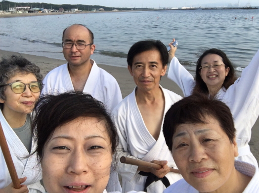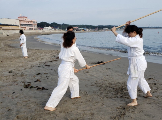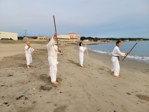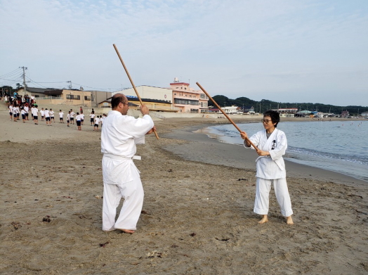今年も、茨城県阿字ヶ浦で、合宿稽古「令和元年8月17日(土)・18日(日)の一泊二日」を行いました。参加人数は6名と少ないながら、内容の濃い稽古ができました。初日の土曜日の午後は、道場として借用していた体育館に畳が無いというハプニングが有り、急きょ稽古内容を変更し、杖の型や武器技の体裁きを中心に稽古を行いました。また、身近に有る物が武器として使われ襲われた時の対処法など、護身術として応用できる技も稽古しました。二日目は、先ず砂浜での朝稽古から始まり、波打ち際でのランニングや杖の型及び合わせを行い、朝食を美味しく頂きました。
